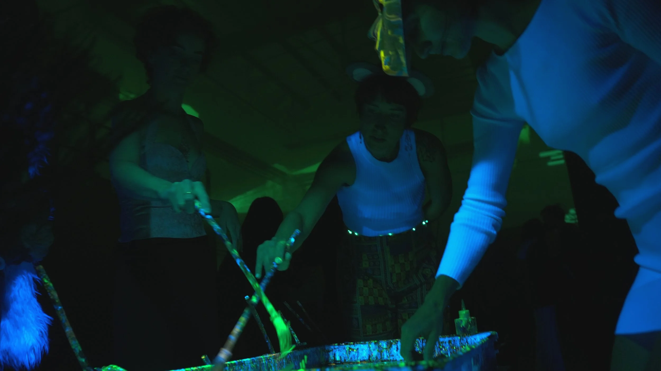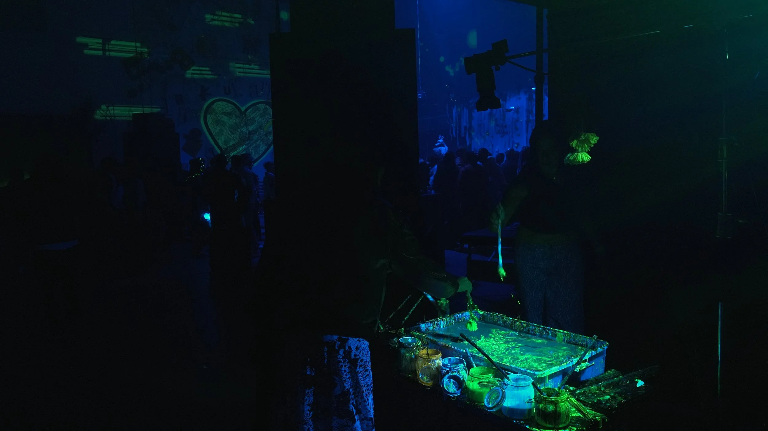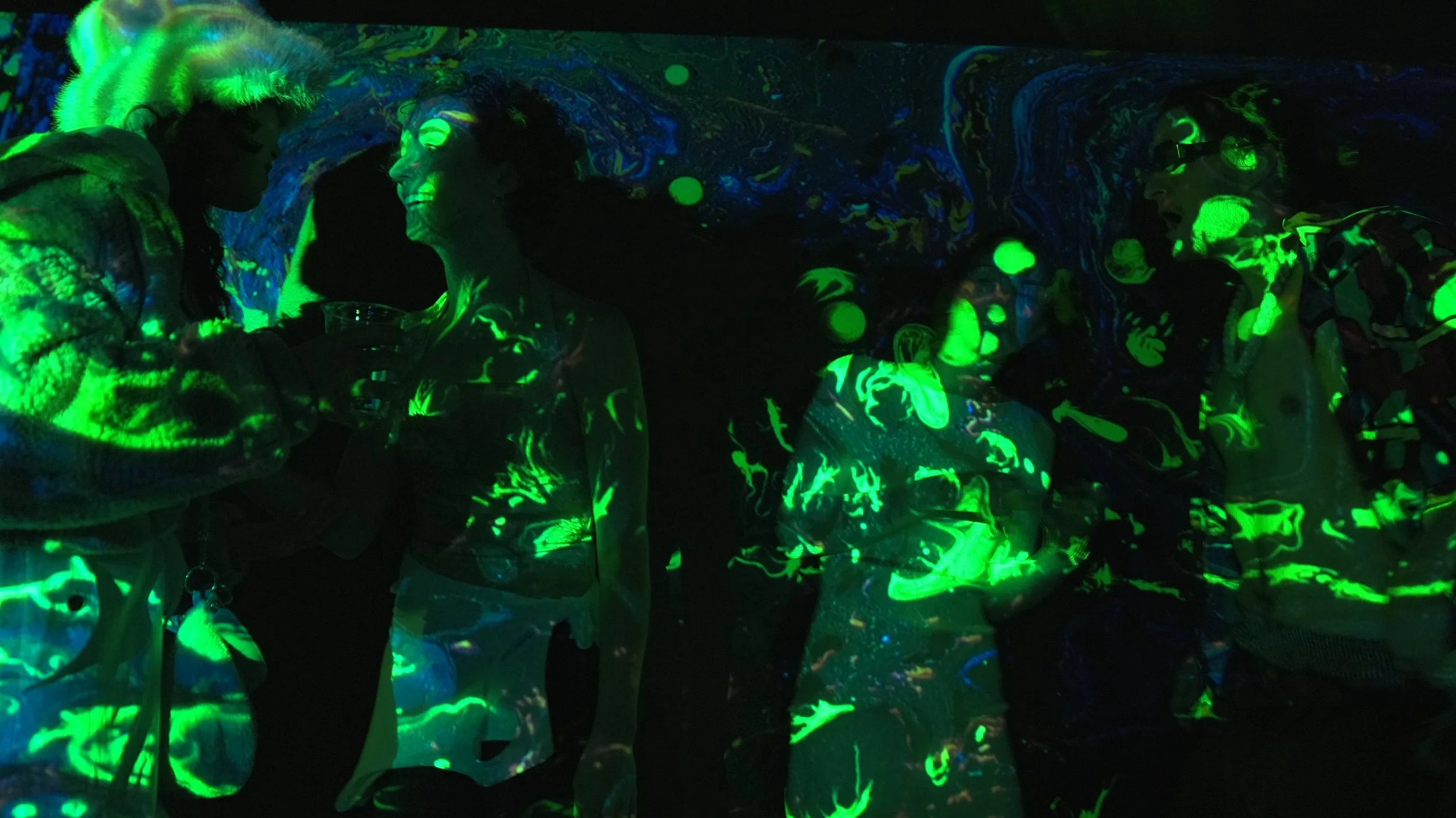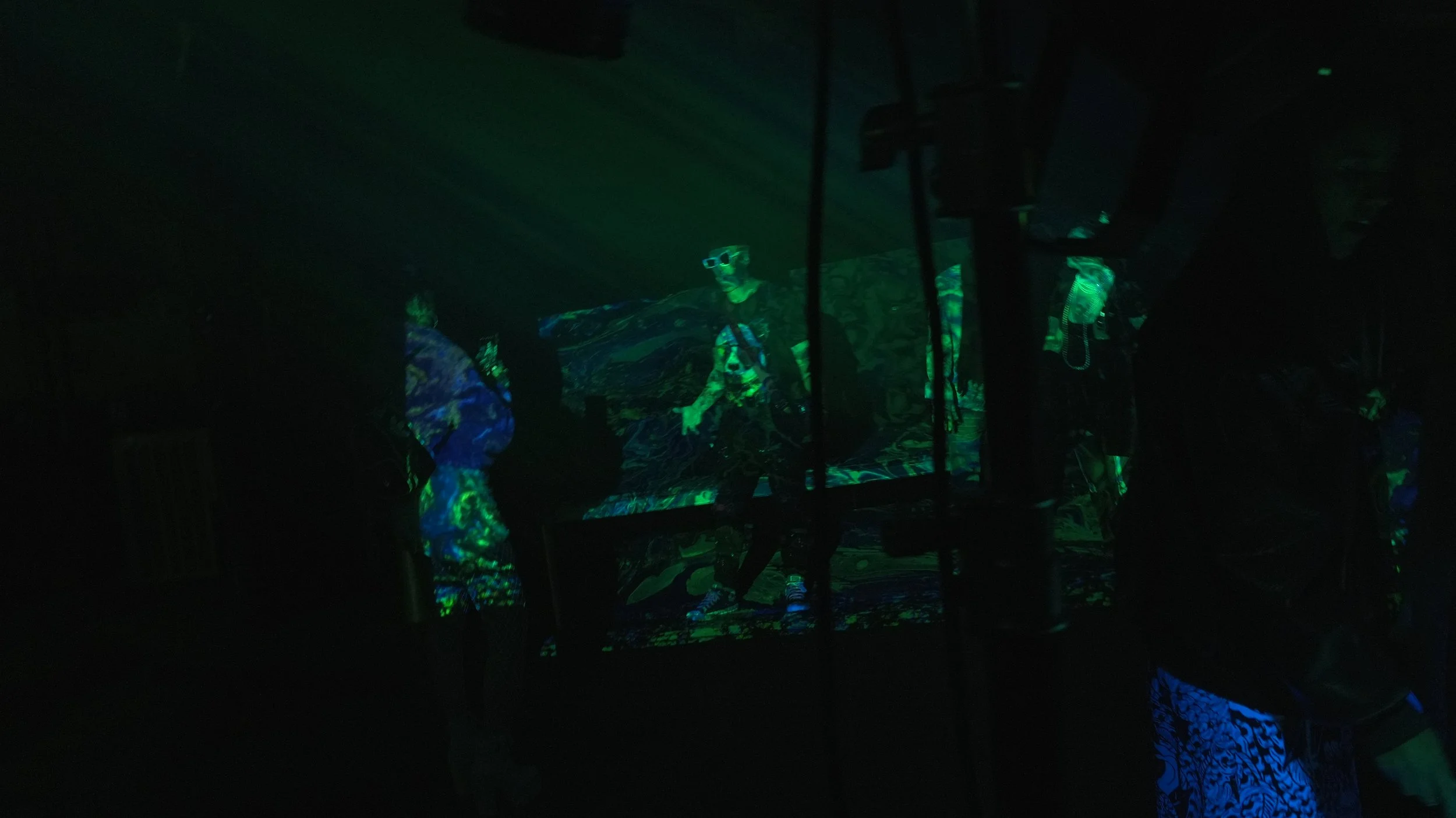 These environments often become collaborative. Participants may join the process—painting alongside me, interacting with the visuals, and contributing to the evolving atmosphere of the performance.